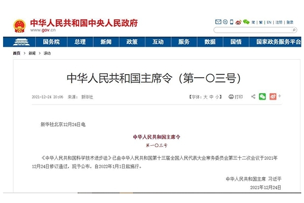 2021年12月24日,中華人民共和國第十三屆全國人民代表大會常務(wù)委員會第三十二次會議修訂通過了《中華人民共和國科學(xué)技術(shù)進步法》。自2022年1月1日起施行。