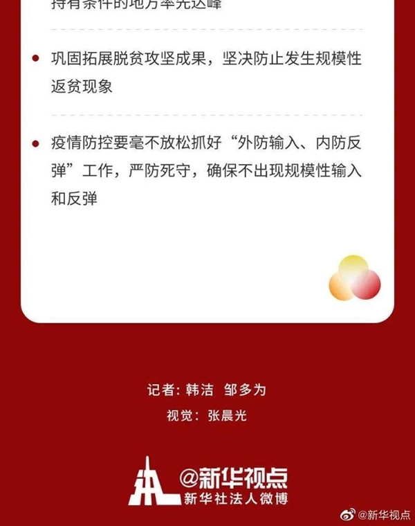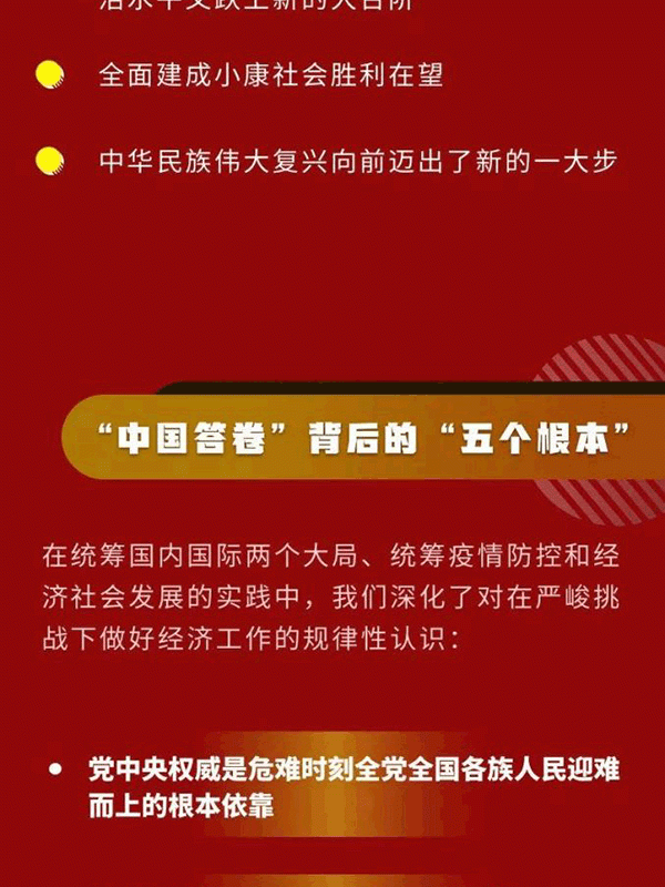 會議強調(diào),在統(tǒng)籌國內(nèi)國際兩個大局、統(tǒng)籌疫情防控和經(jīng)濟社會發(fā)展的實踐中,我們深化了對在嚴峻挑戰(zhàn)下做好經(jīng)濟工作的規(guī)律性認識:黨中央權(quán)威是危難時刻全黨全國各族人民迎難而上的根本依靠,在重大歷史關(guān)頭,重大考驗面前,黨中央的判斷力、決策力、行動力具有決定性作用;人民至上是作出正確抉擇的根本前提,只要心里始終裝著人民,始終把人民利益放在最高位置,就一定能夠作出正確決策,確定最優(yōu)路徑,并依靠人民戰(zhàn)勝一切艱難險阻;制度優(yōu)勢是形成共克時艱磅礴力量的根本保障,只要堅定“四個自信”,堅持集中力量辦大事的制度優(yōu)勢,就一定能夠使全黨全國各族人民緊密團結(jié)起來,發(fā)揮出攻堅克難、推動事業(yè)發(fā)展的強大能量;科學決策和創(chuàng)造性應(yīng)對是化危為機的根本方法,只要準確識變、科學應(yīng)變、主動求變,就一定能夠在抗擊大風險中創(chuàng)造出大機遇;科技自立自強是促進發(fā)展大局的根本支撐,只要秉持科學精神、把握科學規(guī)律、大力推動自主創(chuàng)新,就一定能夠把國家發(fā)展建立在更加安全、更為可靠的基礎(chǔ)之上。