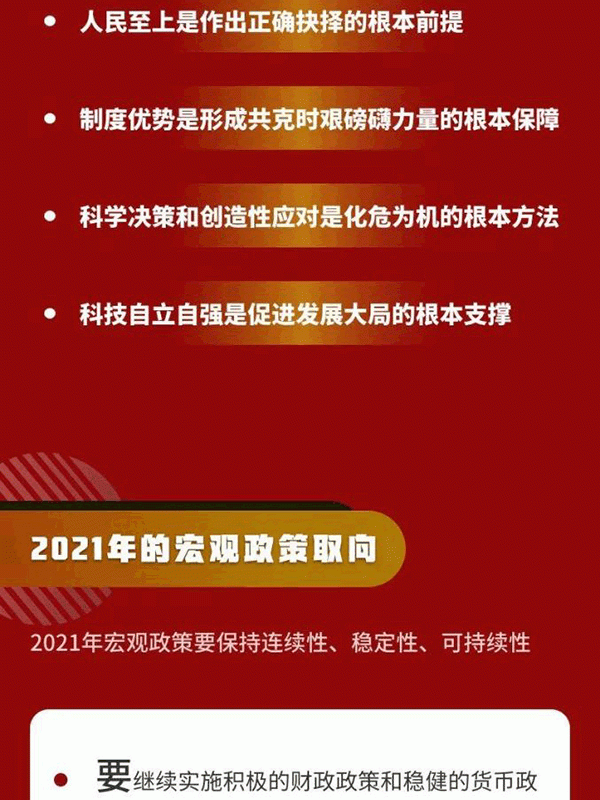 會議指出,明年宏觀政策要保持連續(xù)性、穩(wěn)定性、可持續(xù)性。要繼續(xù)實施積極的財政政策和穩(wěn)健的貨幣政策,保持對經(jīng)濟恢復的必要支持力度,政策操作上要更加精準有效,不急轉(zhuǎn)彎,把握好政策時度效。要用好寶貴時間窗口,集中精力推進改革創(chuàng)新,以高質(zhì)量發(fā)展為“十四五”開好局。積極的財政政策要提質(zhì)增效、更可持續(xù),保持適度支出強度,增強國家重大戰(zhàn)略任務(wù)財力保障,在促進科技創(chuàng)新、加快經(jīng)濟結(jié)構(gòu)調(diào)整、調(diào)節(jié)收入分配上主動作為,抓實化解地方政府隱性債務(wù)風險工作,黨政機關(guān)要堅持過緊日子。穩(wěn)健的貨幣政策要靈活精準、合理適度,保持貨幣供應(yīng)量和社會融資規(guī)模增速同名義經(jīng)濟增速基本匹配,保持宏觀杠桿率基本穩(wěn)定,處理好恢復經(jīng)濟和防范風險關(guān)系,多渠道補充銀行資本金,完善債券市場法制,加大對科技創(chuàng)新、小微企業(yè)、綠色發(fā)展的金融支持,深化利率匯率市場化改革,保持人民幣匯率在合理均衡水平上的基本穩(wěn)定。