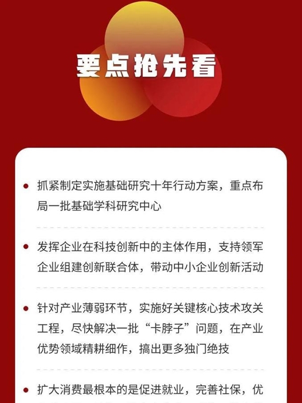 一是強化國家戰(zhàn)略科技力量。要充分發(fā)揮國家作為重大科技創(chuàng)新組織者的作用,堅持戰(zhàn)略性需求導向,確定科技創(chuàng)新方向和重點,著力解決制約國家發(fā)展和安全的重大難題。要發(fā)揮新型舉國體制優(yōu)勢,發(fā)揮好重要院所高校國家隊作用,推動科研力量優(yōu)化配置和資源共享。要抓緊制定實施基礎(chǔ)研究十年行動方案,重點布局一批基礎(chǔ)學科研究中心,支持有條件的地方建設(shè)國際和區(qū)域科技創(chuàng)新中心。要發(fā)揮企業(yè)在科技創(chuàng)新中的主體作用,支持領(lǐng)軍企業(yè)組建創(chuàng)新聯(lián)合體,帶動中小企業(yè)創(chuàng)新活動。要加強國際科技交流合作。要加快國內(nèi)人才培養(yǎng),使更多青年優(yōu)秀人才脫穎而出。要完善激勵機制和科技評價機制,落實好攻關(guān)任務(wù)“揭榜掛帥”等機制。要規(guī)范科技倫理,樹立良好學風和作風,引導科研人員專心致志、扎實進取。