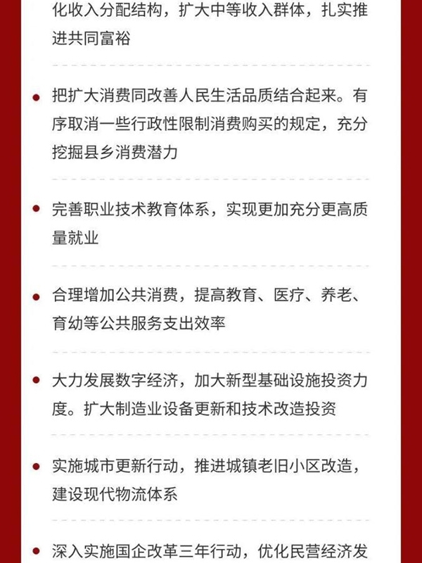 三是堅持擴大內(nèi)需這個戰(zhàn)略基點。形成強大國內(nèi)市場是構(gòu)建新發(fā)展格局的重要支撐,必須在合理引導消費、儲蓄、投資等方面進行有效制度安排。擴大消費最根本的是促進就業(yè),完善社保,優(yōu)化收入分配結(jié)構(gòu),擴大中等收入群體,扎實推進共同富裕。要把擴大消費同改善人民生活品質(zhì)結(jié)合起來。有序取消一些行政性限制消費購買的規(guī)定,充分挖掘縣鄉(xiāng)消費潛力。要完善職業(yè)技術(shù)教育體系,實現(xiàn)更加充分更高質(zhì)量就業(yè)。要合理增加公共消費,提高教育、醫(yī)療、養(yǎng)老、育幼等公共服務(wù)支出效率。要增強投資增長后勁,繼續(xù)發(fā)揮關(guān)鍵作用。要發(fā)揮中央預算內(nèi)投資在外溢性強、社會效益高領(lǐng)域的引導和撬動作用。激發(fā)全社會投資活力。要大力發(fā)展數(shù)字經(jīng)濟,加大新型基礎(chǔ)設(shè)施投資力度。要擴大制造業(yè)設(shè)備更新和技術(shù)改造投資。要實施城市更新行動,推進城鎮(zhèn)老舊小區(qū)改造,建設(shè)現(xiàn)代物流體系。要加強統(tǒng)一規(guī)劃和宏觀指導,統(tǒng)籌好產(chǎn)業(yè)布局,避免新興產(chǎn)業(yè)重復建設(shè)。