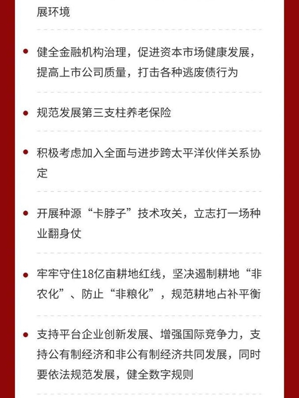 四是全面推進改革開放。構(gòu)建新發(fā)展格局,必須構(gòu)建高水平社會主義市場經(jīng)濟體制,實行高水平對外開放,推動改革和開放相互促進。要完善宏觀經(jīng)濟治理,加強國際宏觀政策協(xié)調(diào)。要深入實施國企改革三年行動,優(yōu)化民營經(jīng)濟發(fā)展環(huán)境,健全現(xiàn)代企業(yè)制度,完善公司治理,激發(fā)各類市場主體活力。要放寬市場準入,促進公平競爭,保護知識產(chǎn)權(quán),建設(shè)統(tǒng)一大市場,營造市場化、法治化、國際化營商環(huán)境。要健全金融機構(gòu)治理,促進資本市場健康發(fā)展,提高上市公司質(zhì)量,打擊各種逃廢債行為。要規(guī)范發(fā)展第三支柱養(yǎng)老保險。要積極考慮加入全面與進步跨太平洋伙伴關(guān)系協(xié)定。要大力提升國內(nèi)監(jiān)管能力和水平,完善安全審查機制,重視運用國際通行規(guī)則維護國家安全。