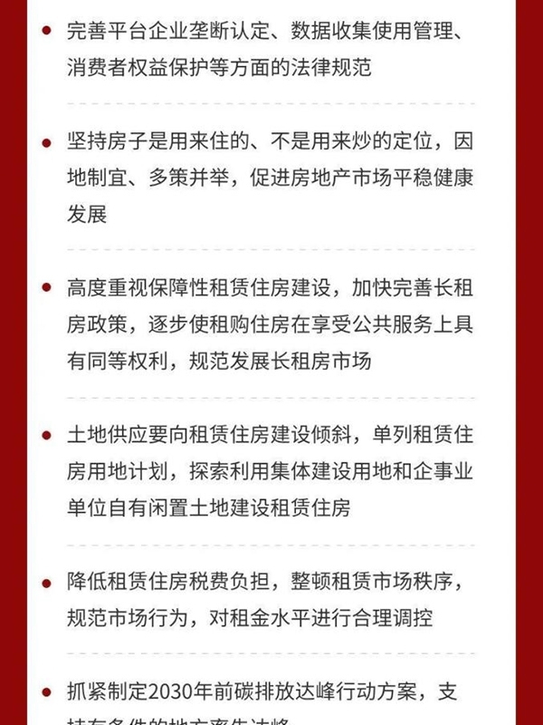 七是解決好大城市住房突出問題。住房問題關(guān)系民生福祉。要堅持房子是用來住的、不是用來炒的定位,因地制宜、多策并舉,促進房地產(chǎn)市場平穩(wěn)健康發(fā)展。要高度重視保障性租賃住房建設(shè),加快完善長租房政策,逐步使租購住房在享受公共服務(wù)上具有同等權(quán)利,規(guī)范發(fā)展長租房市場。土地供應(yīng)要向租賃住房建設(shè)傾斜,單列租賃住房用地計劃,探索利用集體建設(shè)用地和企事業(yè)單位自有閑置土地建設(shè)租賃住房,國有和民營企業(yè)都要發(fā)揮功能作用。要降低租賃住房稅費負擔,整頓租賃市場秩序,規(guī)范市場行為,對租金水平進行合理調(diào)控。