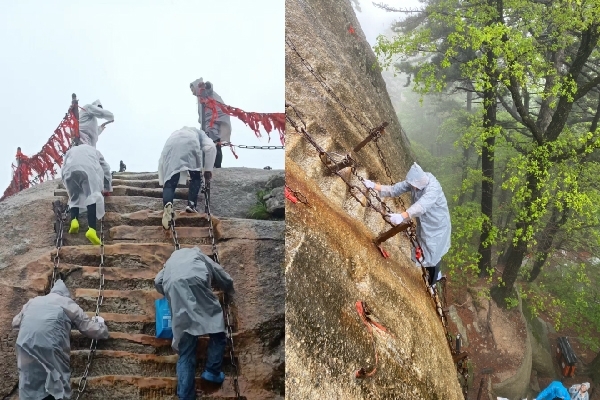 繼續(xù)上行到達華山青龍脊,紅色的飄帶與銅鎖在山中,隨著風雨飄蕩,云霧似雪,紅色的飄帶寓意愛情永存,愛人永不變心。