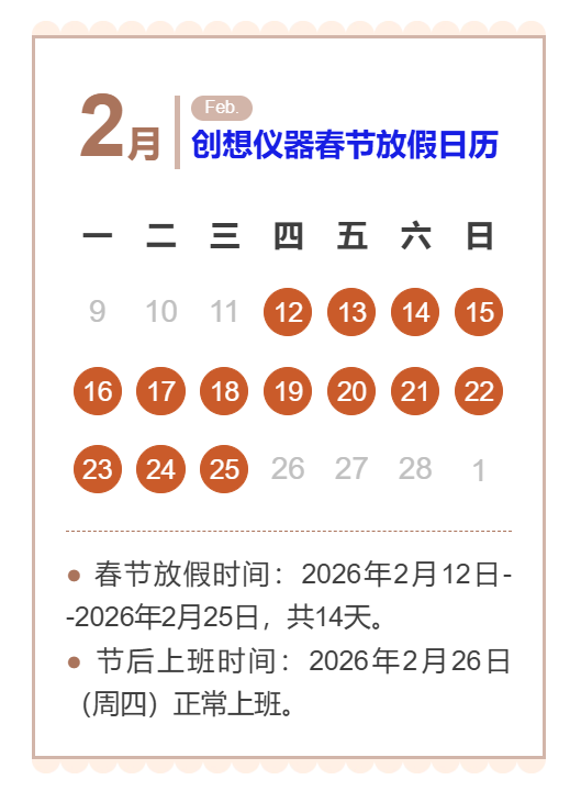 2026年無錫創(chuàng)想儀器有限公司春節(jié)放假通知。