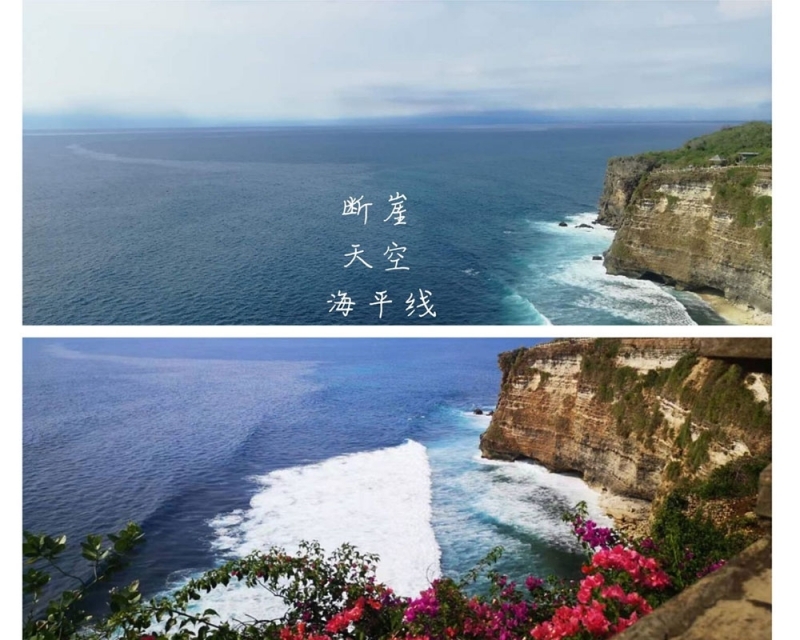烏魯瓦圖斷崖位于巴厘島的最南端,是我們此行的最后一站,沿途的猴子據(jù)說會搶游客的帽子和眼鏡,讓我們一路有些忐忑,生怕遭遇這些“劫匪”。當(dāng)我們終于站在斷崖的最高處,遠(yuǎn)處海平線和天相接,海色融于天空,在別處很難看到如此開闊的海平線,頗為壯觀。而斷崖下水石相搏,浪花翻涌,又別是一番景致。大家紛紛駐足拍照,而見到金發(fā)美女就求合影的馬工更是沒有放過這個絕好的機(jī)會,和三位美女留影合照,熾烈的陽光下,馬工漆黑的膚色優(yōu)勢仿佛也沒成功搶鏡。