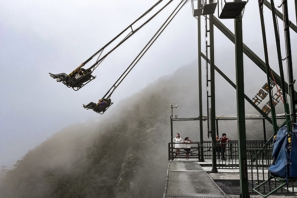 因為在云端,有云有霧實在太正常了,讓我拍出來的照片,都帶了層層的天然濾鏡。小伙伴們都去找項目玩上了:在“‘懸崖秋千’,驚聲尖叫”、“‘水晶廊橋’,一步一趨”、“‘凌空飛步’,顫抖蹦跳”、“‘云中漫道’,站立云端”、“空中自行車”、“彩虹滑草”、“軌道滑草”、“射箭”、“射擊”、“卡丁車”等等多項活動,讓人流連忘返。我們一起來看。